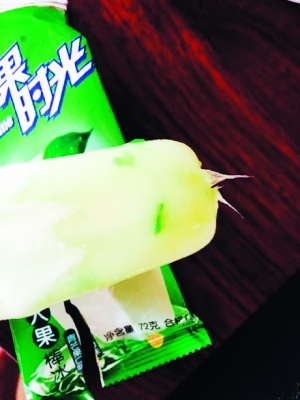許先生說:“那天下午兩點多,我去超市買了6個宏寶萊的鮮果時光雪糕,回家后我和父母每人吃了一個,而我的那個雪糕沒吃幾口就咬到一個硬物。我以為是椰果,便用力咬了一下,卻發(fā)現(xiàn)根本咬不動,低頭一看,發(fā)現(xiàn)雪糕里露出一塊塑料布。因為我用力咬,這塊塑料布已被拽出一部分,還有一部分凍在里面?!庇浾呖吹皆S先生拿出的雪糕上半部分露出了兩塊塑料布。