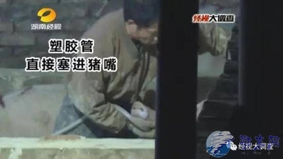 這里竟然是一個隱藏的灌豬增重的現(xiàn)場,這里一共有三名工人,一人負責拿管子往住嘴里塞,一人負責打開灌注的開關(guān),另一人負責趕豬。