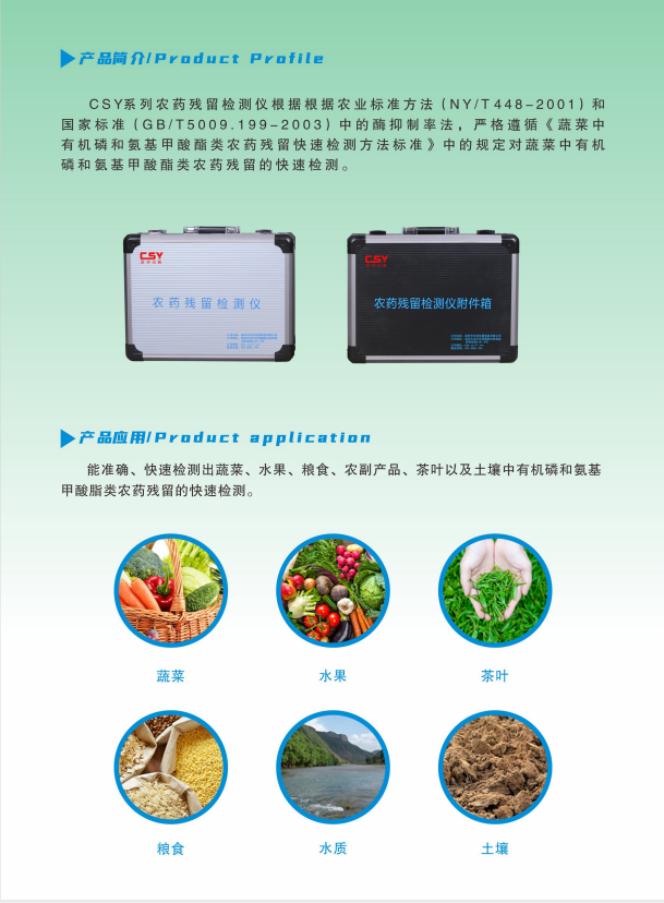 深芬儀器CSY系列農藥殘留快速測定儀可以對瓜果蔬菜的農藥殘留進行準確的檢測和篩查,杜絕超標的農產品流入市場。農藥殘留快速測定儀可廣泛應用于各級蔬菜檢測中心、農貿市場、超市、環(huán)保機構、蔬菜種植基地、飯店、車載及實驗室等食品安全檢測與監(jiān)控場所等單位對果蔬中農藥殘留的檢測。