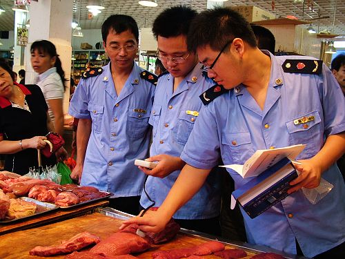 隨后,記者向食藥監(jiān)部門反映此事,當(dāng)日14時許,海口市瓊山區(qū)中山食品藥品監(jiān)督管理所執(zhí)法人員趕到現(xiàn)場。執(zhí)法人員用手摸了摸攤位上的牛肉,并沒有立即做出判斷?!笆遣皇亲⑺H?,通常可以用手摸,看看黏不黏手,但這不能作為執(zhí)法的依據(jù)?!眻?zhí)法人員隨即聯(lián)系了瓊山區(qū)食品藥品監(jiān)督管理局有關(guān)負(fù)責(zé)人,詢問是否可以用食品快檢車檢測注水肉,得到的答復(fù)是“暫時不可以”。該執(zhí)法人員稱,目前??谑乘幈O(jiān)部門正計劃引進(jìn)一種可以快速檢測注水肉的儀器CSY-R肉類水分測定儀,待儀器配備到位后,他們將對培龍市場的所有鮮肉攤進(jìn)行檢測,排除隱患。