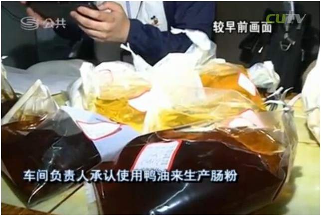 在執(zhí)法人員查獲6桶來歷不明的油之后,車間負責人承認使用鴨油來生產(chǎn)腸粉?!斑@是什么油?”“是鴨油?!薄翱绝喪O碌哪欠N?”“對。”