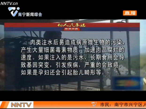 南寧市食品藥品監(jiān)督管理局局長黃明瑞回應(yīng):對于注水肉的問題,我們從改革以來就一直堅持打擊,特別是今年夏季針對肉類食品進行了大規(guī)模的整治行動,發(fā)現(xiàn)問題后馬上進行懲處。首先我們要從源頭上杜絕注水肉,第二,肉類在進入市場要進行檢驗檢測,合格以后才能上市銷售,市場開放方要建立查驗查證制度,作為監(jiān)管部門要加大巡查力度,發(fā)現(xiàn)有違法添加的要立案進行查處。