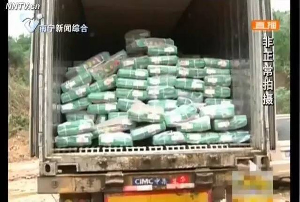 5月7日上午11點30分,劉圩鎮(zhèn)覃坡一處廢棄的木片廠區(qū)內(nèi),兩輛玉林牌照的紅色集裝箱貨車停放在空地,幾個貨車司機邊觀望邊等待。兩小時后,一輛藍色大貨車開進廢棄廠區(qū),并與其中一輛集裝箱貨車尾對尾交接。