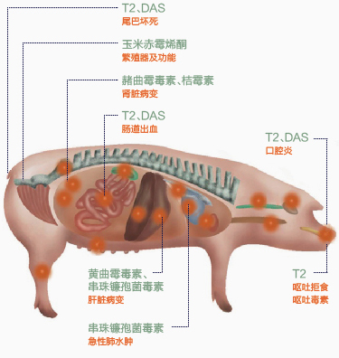 T-2毒素對豬禽的危害:T-2毒素由念珠球菌屬產(chǎn)生,直接損傷皮膚和粘膜。豬主要表現(xiàn)為厭食、嘔吐、生長停滯、瘦弱、皮膚及粘膜壞死、胃腸機(jī)能紊亂、繁殖和神經(jīng)機(jī)能障礙,免疫機(jī)能降低。對家禽造成的影響:產(chǎn)蛋率降低,羽毛生長不良,口腔潰瘍,采食量下降、拒食,神經(jīng)失調(diào),抑制免疫力。